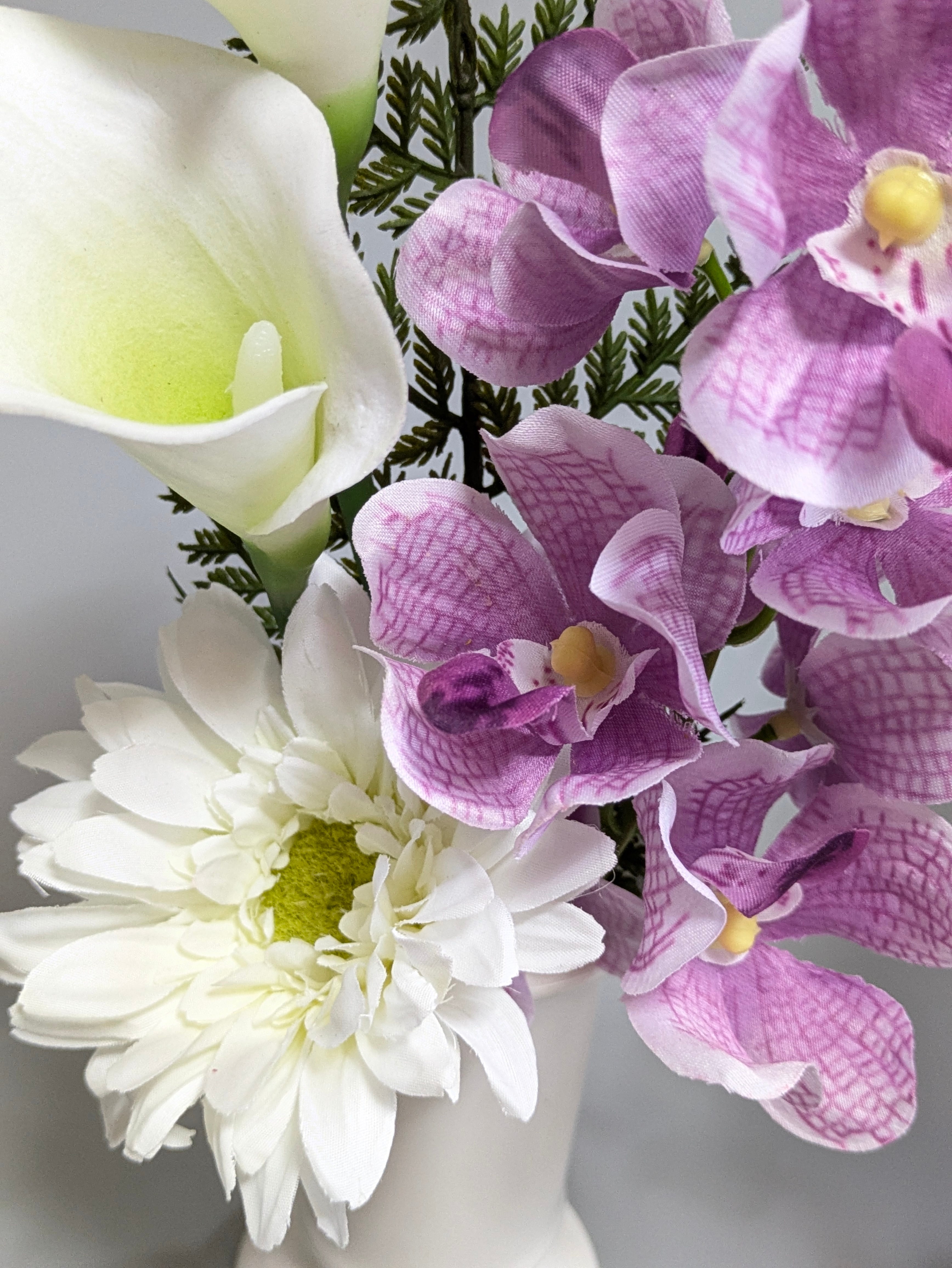華美になりすぎず、故人を静かに偲ぶ場にふさわしい佇まい。 淡い色合いと上品な花材を組み合わせ、現代のインテリア仏壇にも自然に馴染むデザインに仕上げました。アーティフィシャルフラワーだからこそ、長く美しさを保ち、季節を問わずお供えいただけます。茎の部分を白いサテンリボンで巻いてあるので、見た目が美しく上品です。10センチ前後の花瓶に対応致します。故人への想いを、そっと花に託して。 結の綵花が心を込めてお届けする、おすすめの対仏花です。