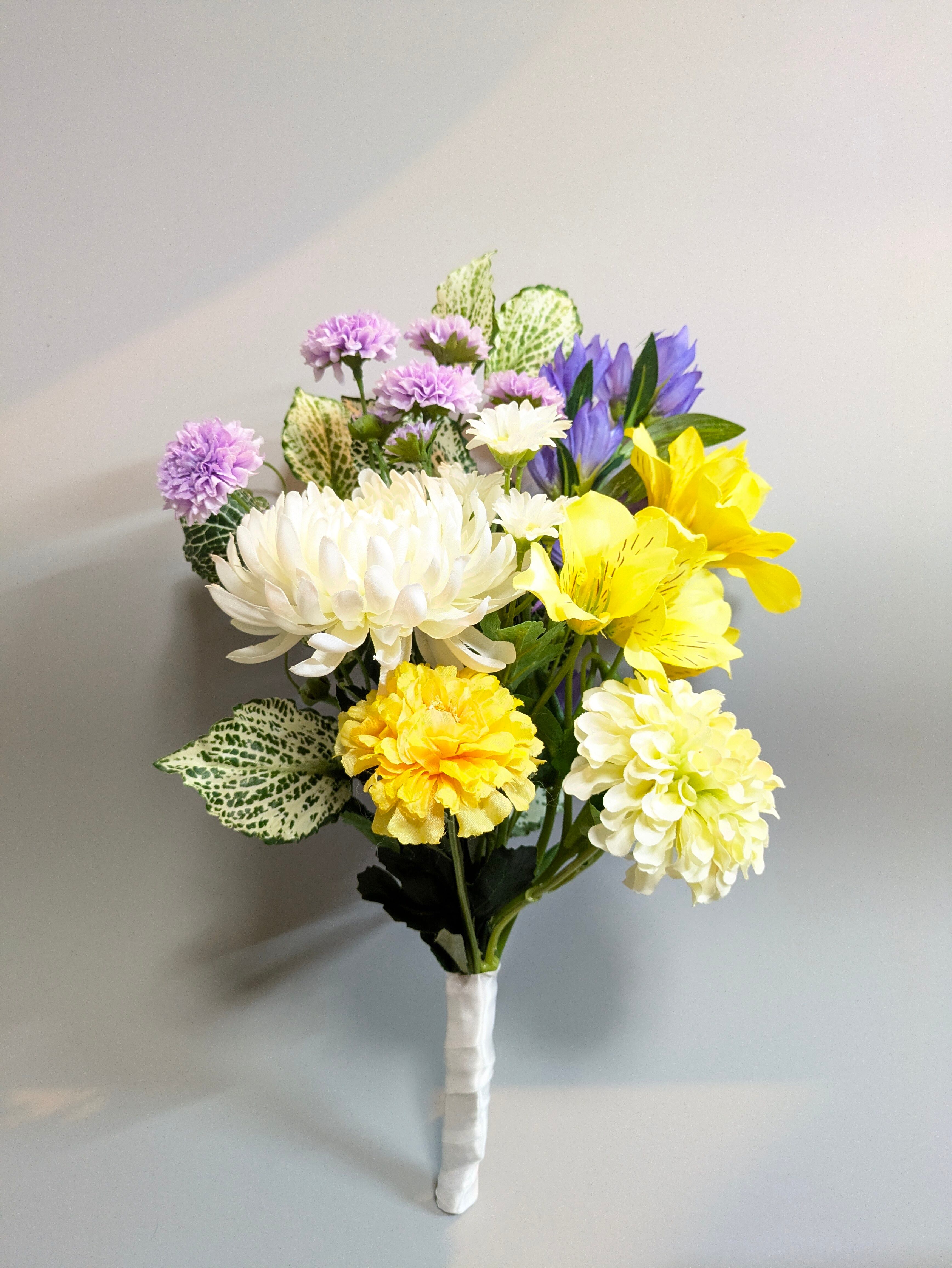 主な花材アーティフィシャルフラワー(造花):輪菊、ポンポンマム、リンドウ、アルストロメリア、ダリア、他グリーン