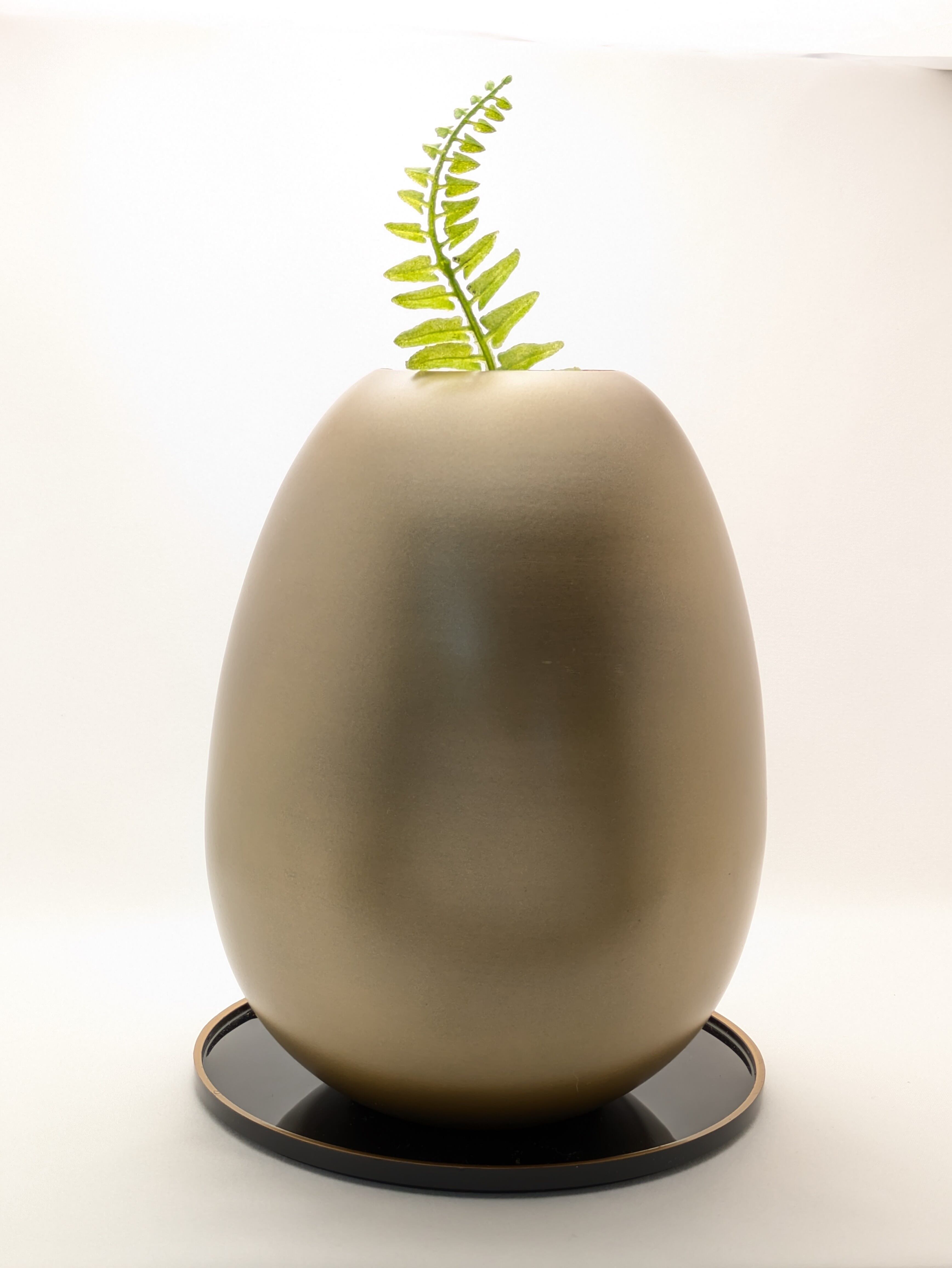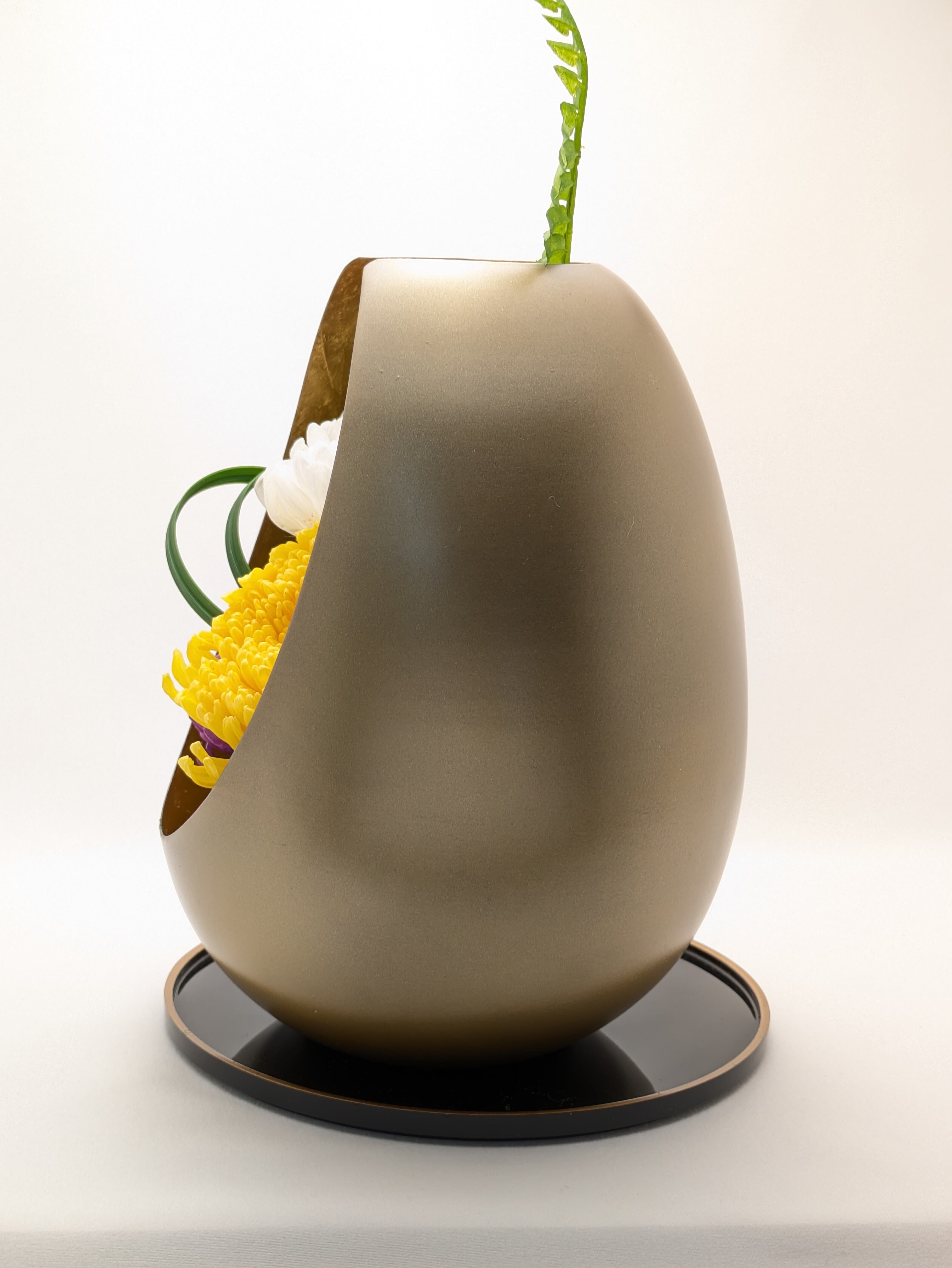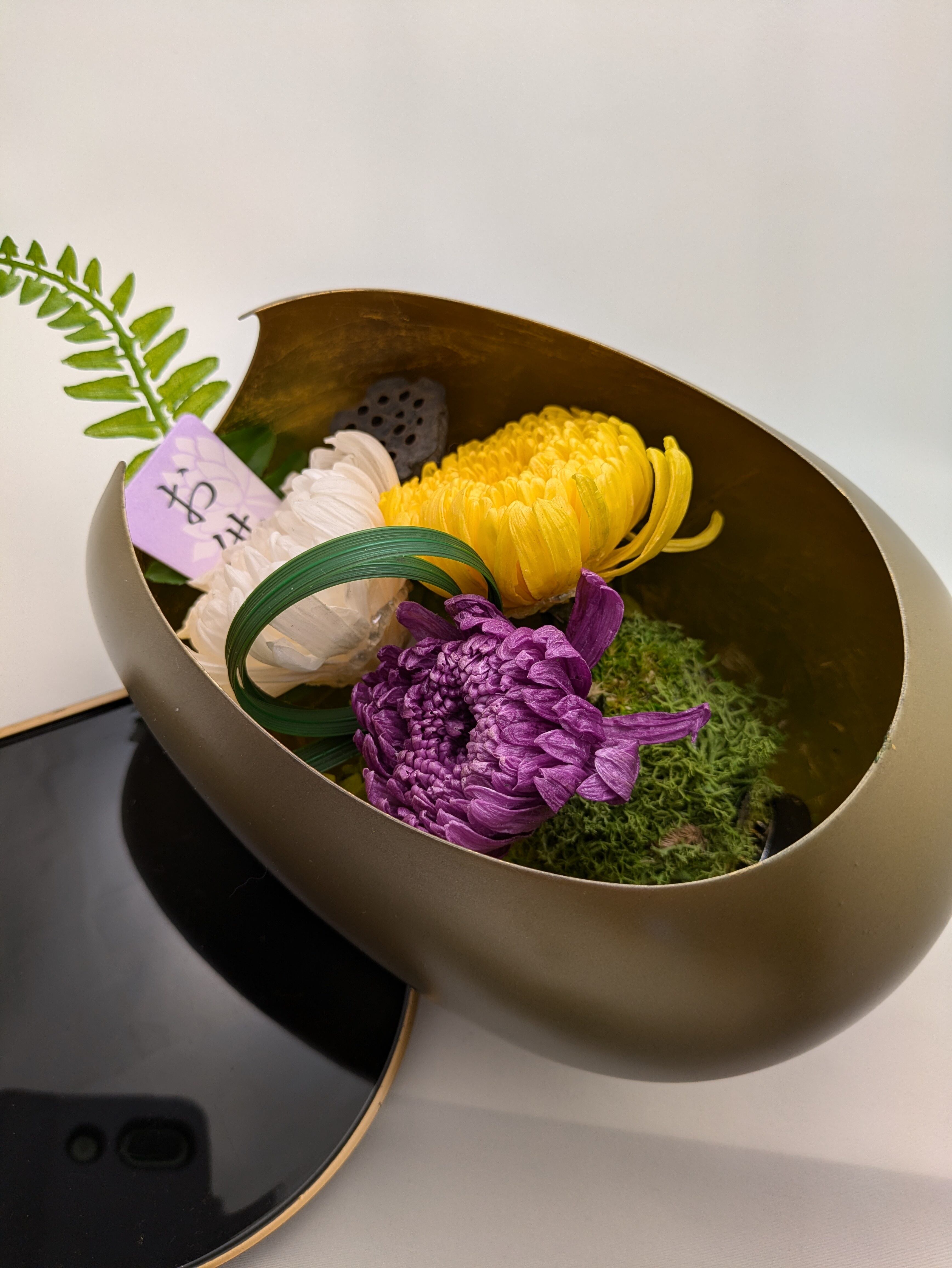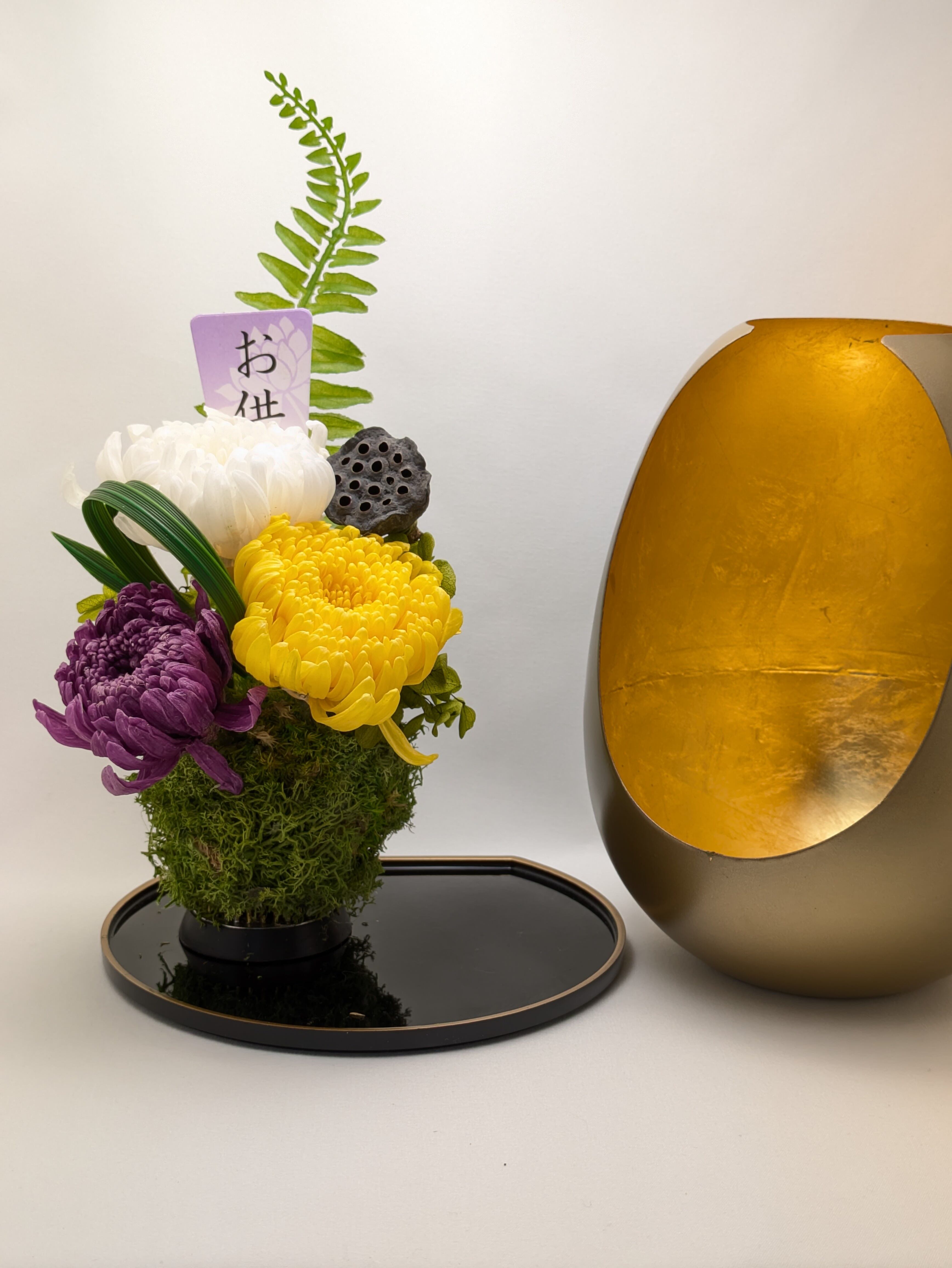 ゴールドの器に凛として佇む菊を美しくコケ玉にアレンジしました。