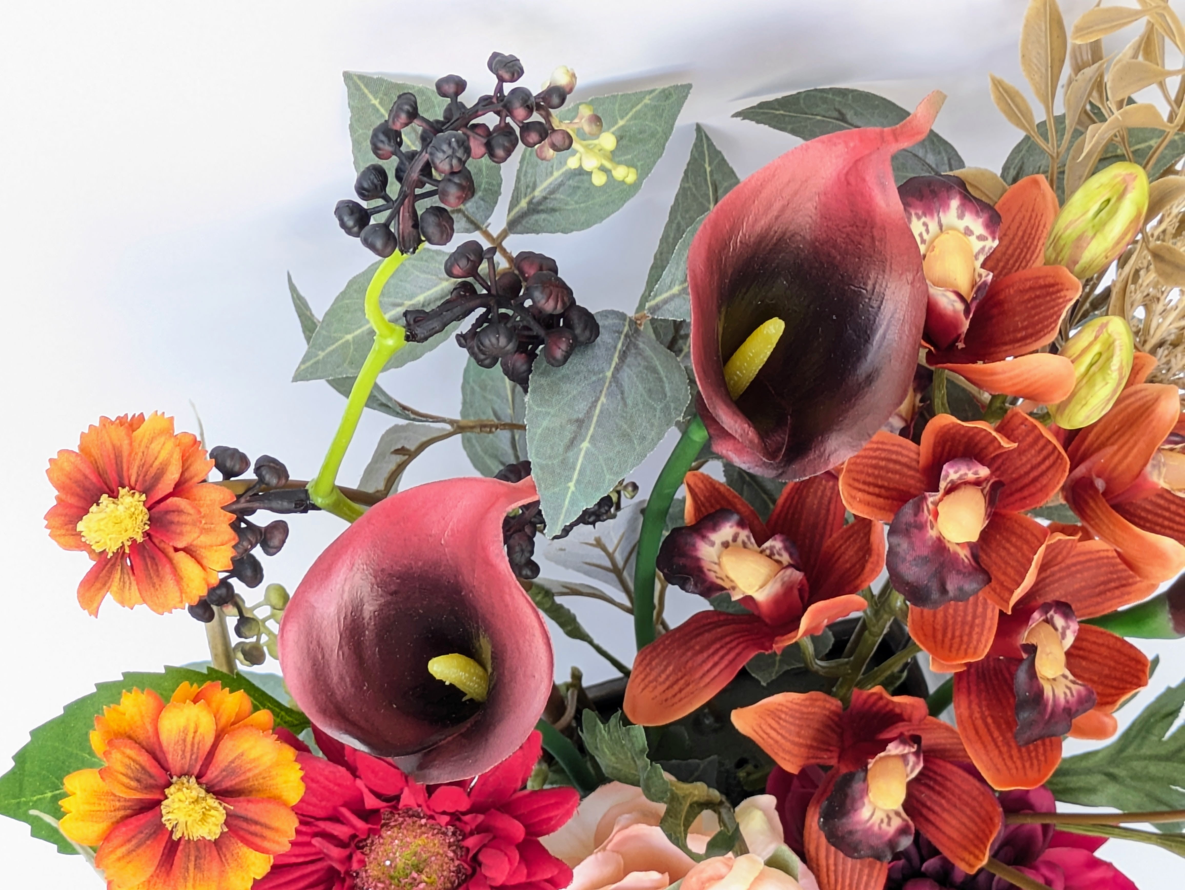 コスモス、シンビジウム、ダリア、カラー、ススキが優雅でシックなフラワーアレンジメント。