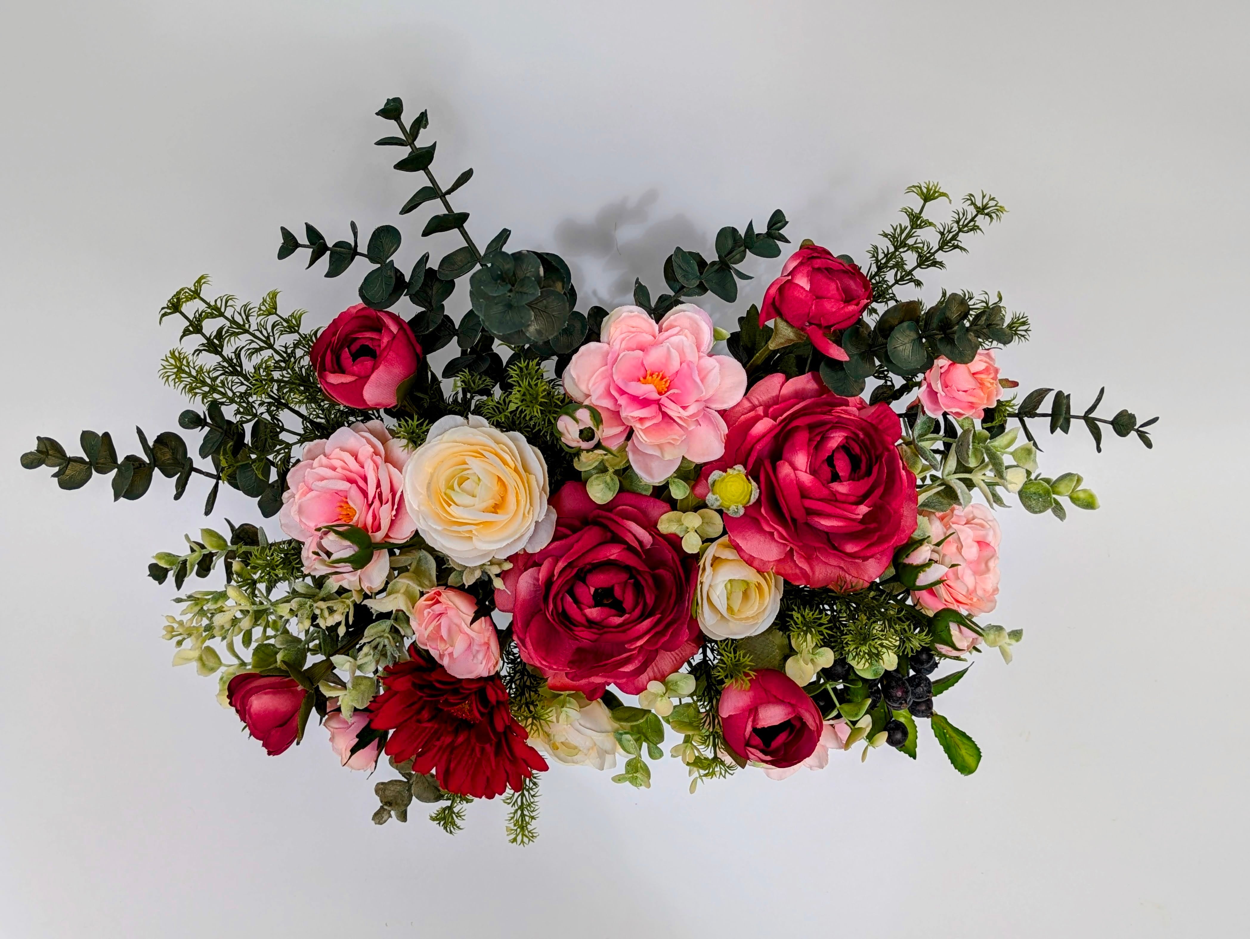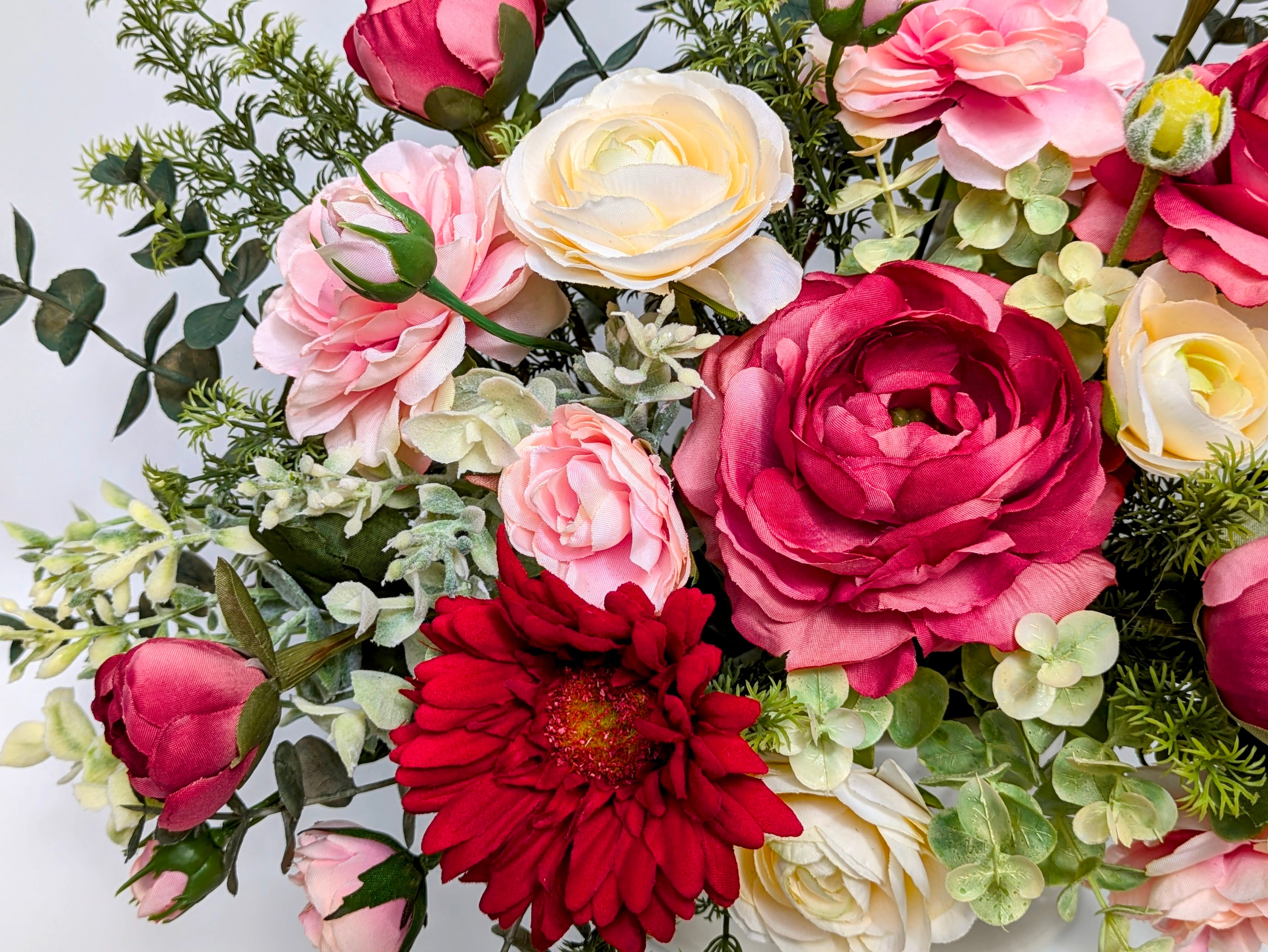 アーティフィシャルフラワー(造花):ラナンキュラス2種、ローズ、、ブルーベリー、ガーベラ、ユーカリ他グリーン